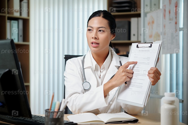 Молодой уверенный в себе медицинский специалист, указывающий на документ во время консультации