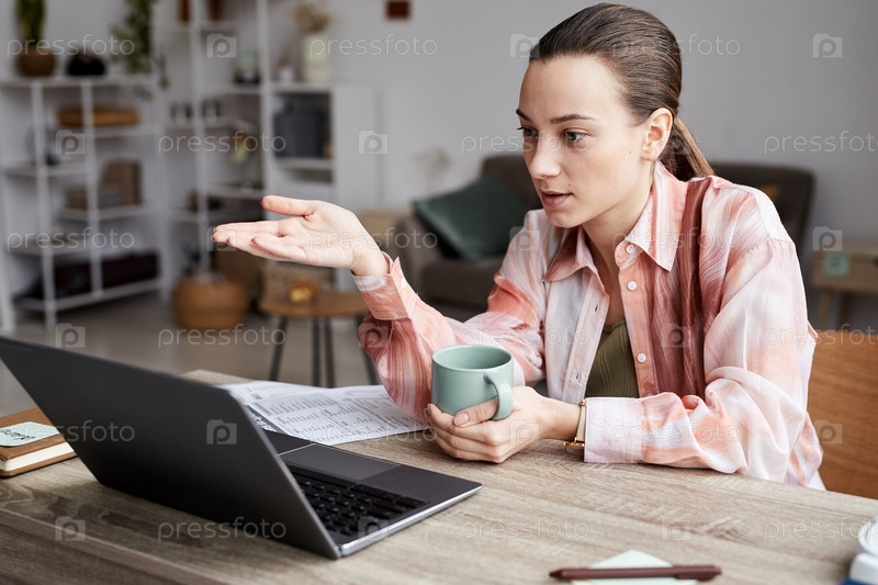 Молодой уверенный репетитор объясняет онлайн-студенту новый предмет перед ноутбуком