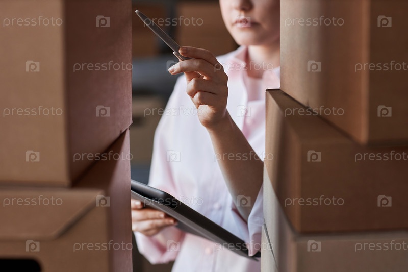 Близкий снимок молодой женщины с ручкой и планшетом, указывающей на одну из посылок