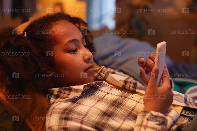Близкий снимок черной девушки, использующей смартфон, лежащей в постели и прокручивающей социальные сети