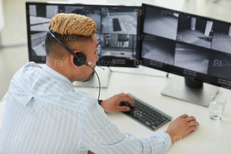Азиатский мужчина, носящий наушники в центре мониторинга и безопасности