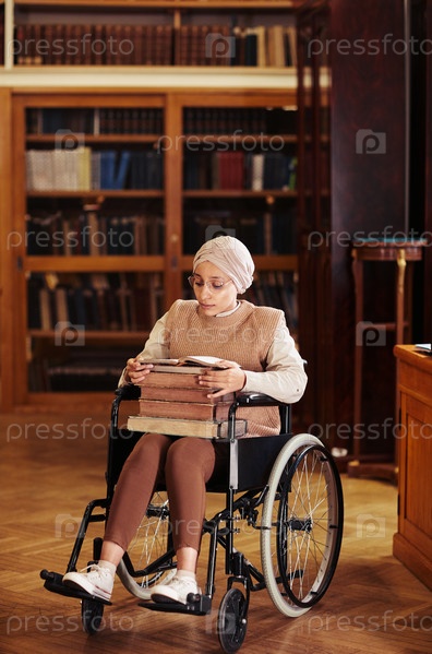 Молодая женщина-инвалид использует инвалидное кресло в библиотеке