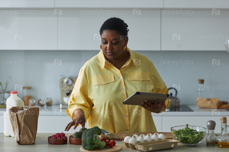 Женщина, использующая планшетный компьютер для приготовления пищи