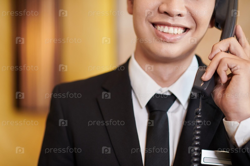 Рецепсионистка отеля разговаривает по телефону