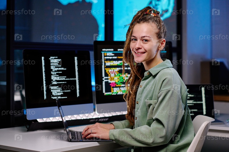 Молодая успешная женщина-программист смотрит на камеру на рабочем месте