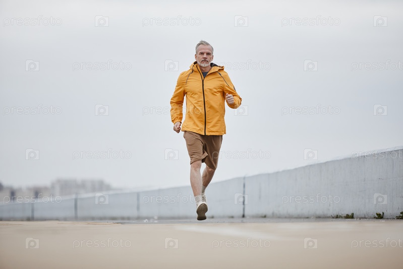 Акционный снимок зрелого мужчины, бегущего по городу