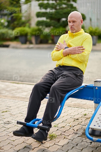 Зрелый мужчина выполняет упражнения по скручиванию