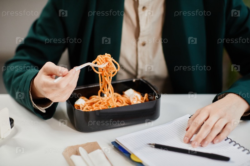 Руки молодой бизнес-жены, получающей китайский вок в коробке с обедом