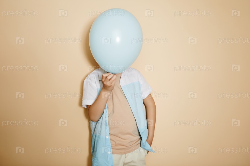 Мальчик, держащий воздушный шар и скрывающий лицо на вечеринке на пастельном фоне