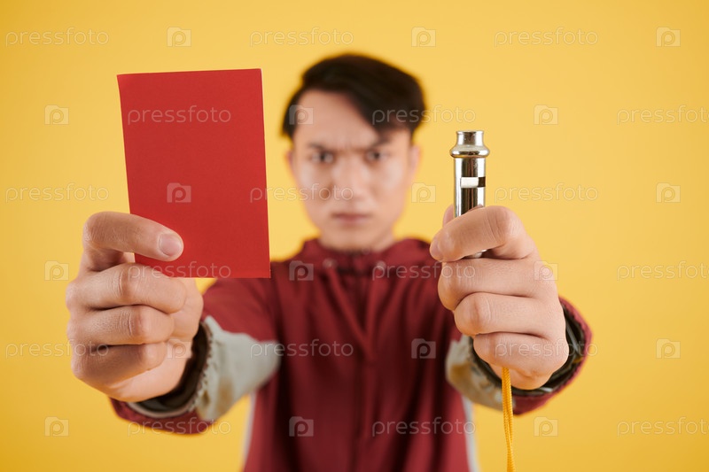 Судья показывает красную карточку и свисток