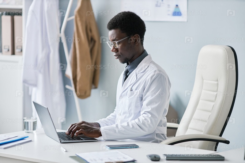 Молодой чернокожий врач использует ноутбук в офисе, печатая, работая на клинике