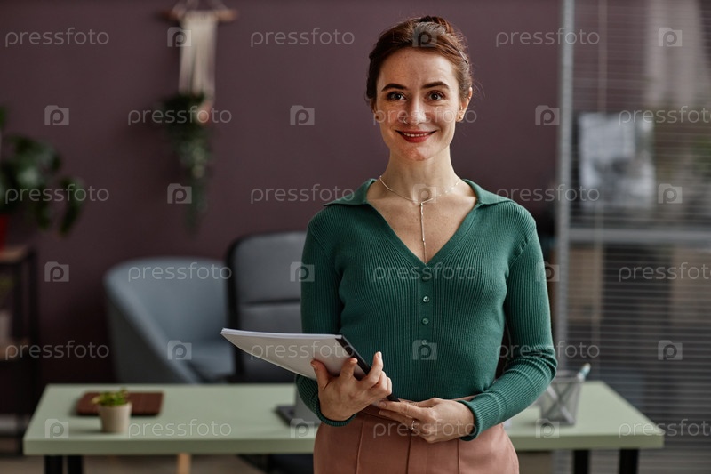 Улыбающаяся молодая женщина смотрит на камеру, стоящая в современном офисе