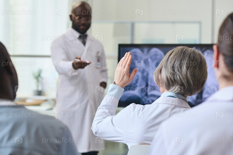 Женщина задает вопросы на медицинской конференции