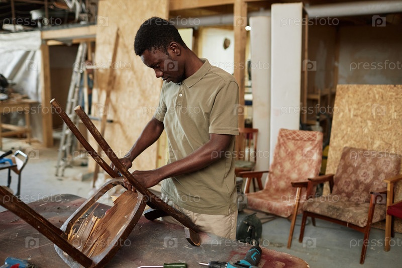 Черный мужчина восстанавливает стул в мебельной мастерской