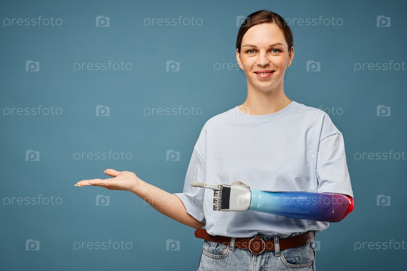 Женщина с бионической рукой показывает проект