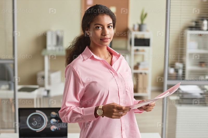 Молодая чернокожая бизнес-женщина, держащая документы, стоит в офисе и улыбается