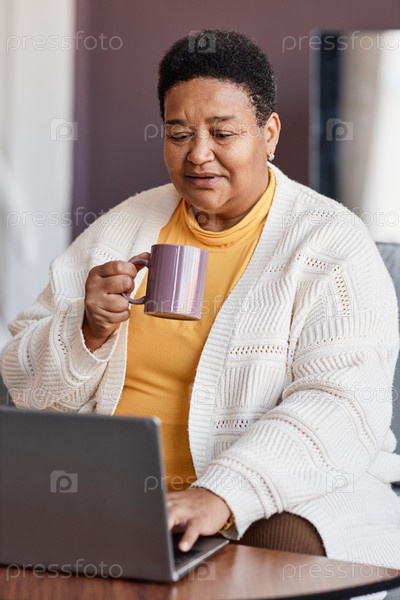 Старшая чернокожая женщина, использующая ноутбук дома