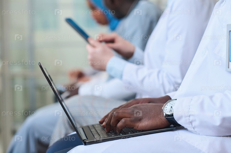Доктор печатает на ноутбуке на конференции