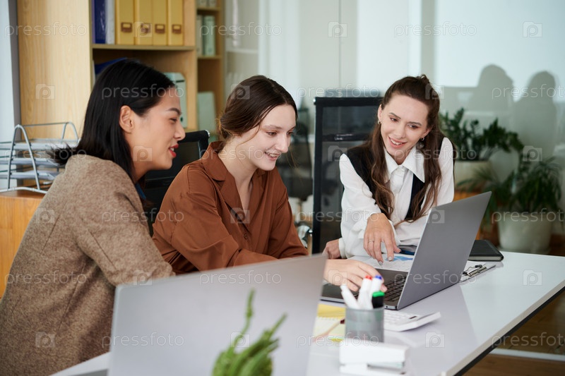 Коллеги обсуждают онлайн-презентацию на ноутбуке