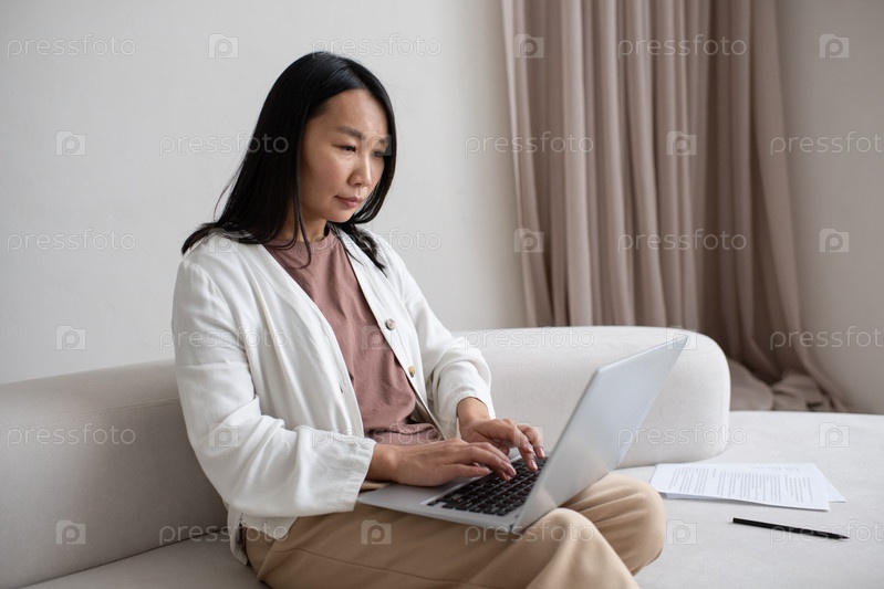 Молодая серьезная сотрудница с ноутбуком на коленях, сосредоточенная на сети