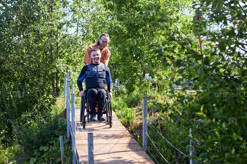 Счастливый мужчина в инвалидном кресле готов пойти на дайвинг с помощью инструктора