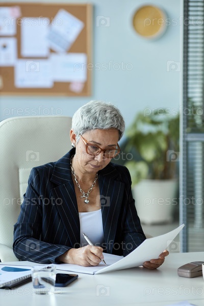 Вертикальная старшая женщина в роли женского босса на рабочем месте в офисе