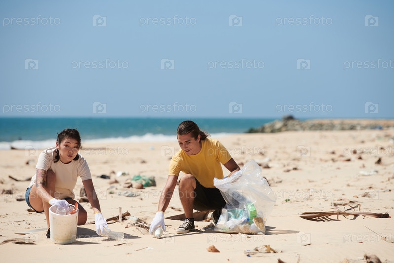 Разнообразная пара собирает мусор