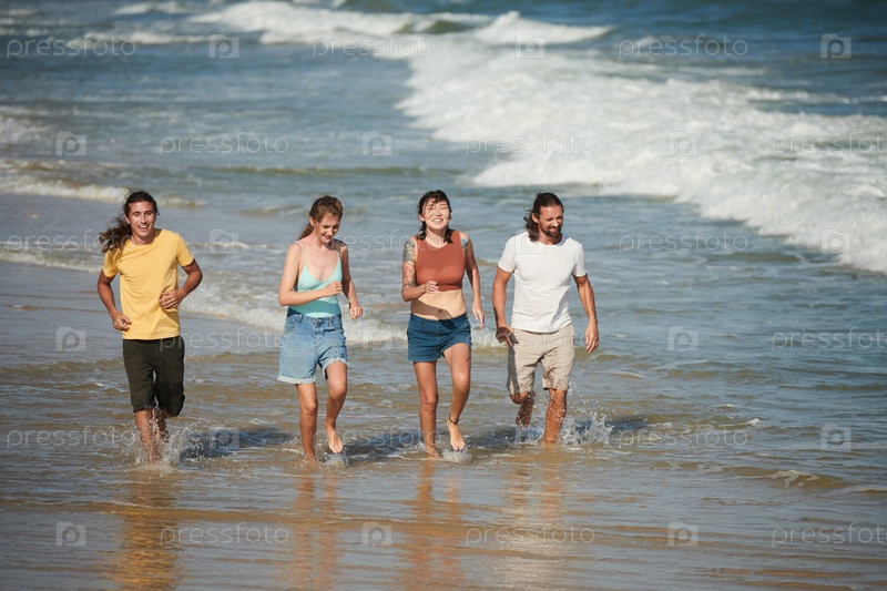 Молодые люди бегут на пляже