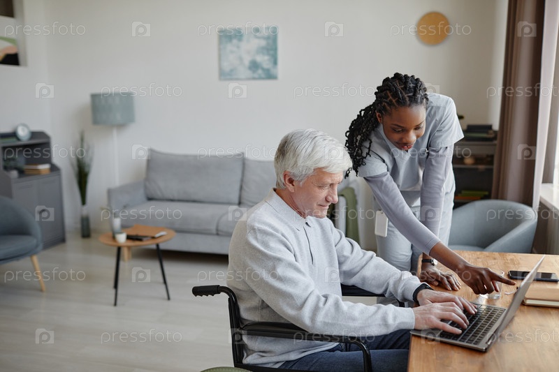 Женщина в качестве домашней медсестры помогает пожилому человеку на инвалидном кресле с помощью компьютера