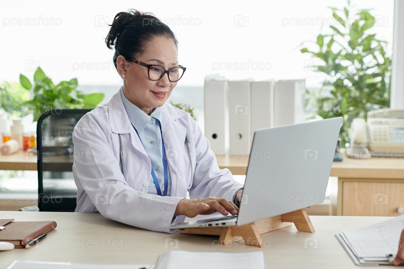 Улыбающийся доктор работает на ноутбуке