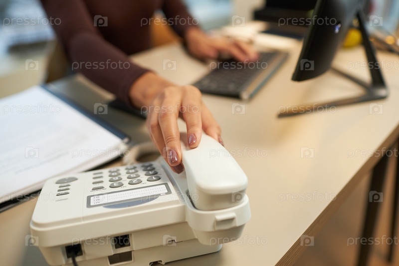 Близкий план молодой женщины, отвечающей на телефонные звонки за столом в офисе