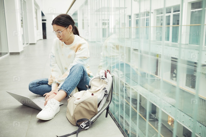 Серьезная девочка-подросток азиатской этнической принадлежности в повседневной одежде на полу