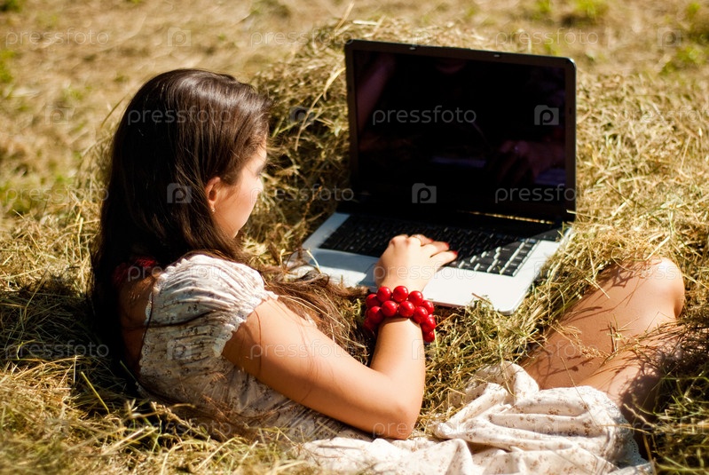 Девушка на сеновале с ноутбуком