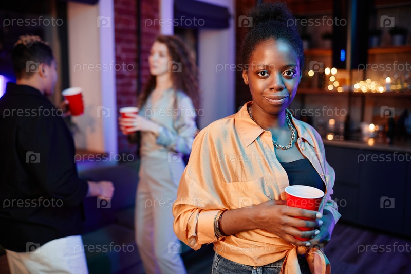 Счастливая афроамериканская девушка в повседневной одежде, держащая бокал с алкогольным напитком