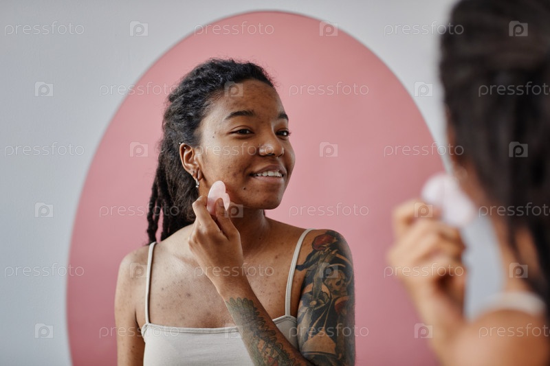 Молодая чернокожая женщина с рубцами от акне, использующая массажер для лица во время процедуры красоты