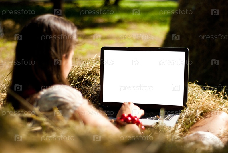 Девушка на сеновале с ноутбуком