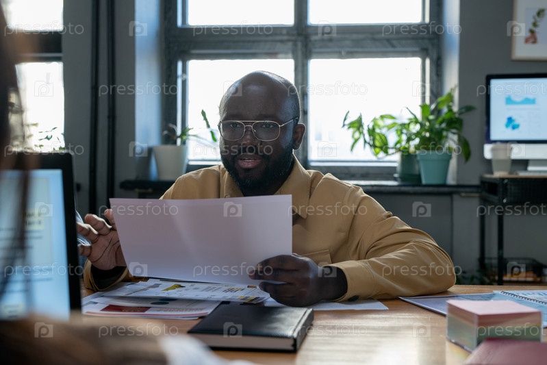 Уверенный афроамериканский экономист с работой, объясняющей финансовые данные