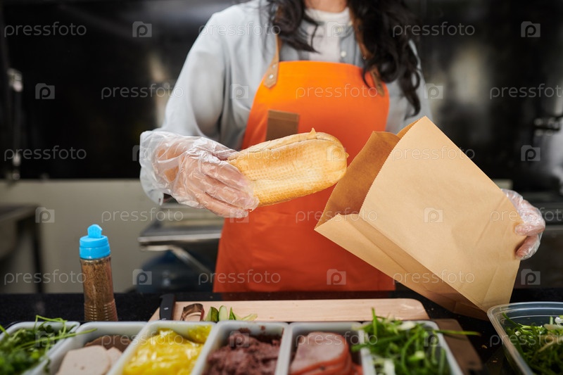 Работник пищевого грузовика упаковывает бутерброд