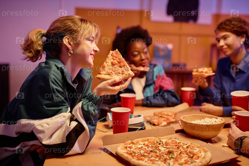 Улыбающаяся девушка ест пиццу с группой друзей на домашней вечеринке