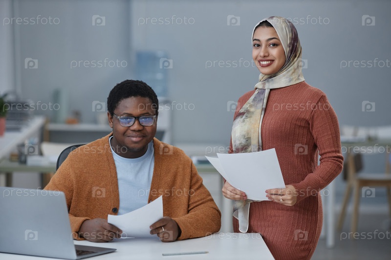 Два молодых успешных экономиста в повседневной одежде смотрят на камеру по рабочему месту
