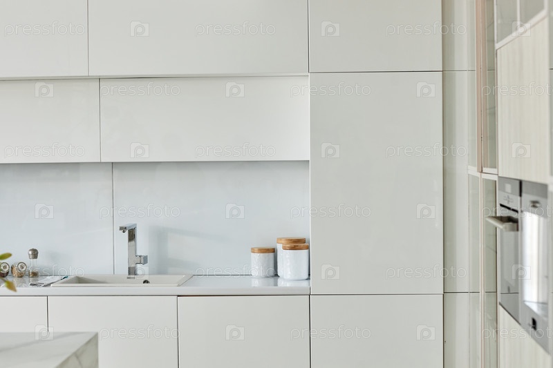 Белая яркая кухня с красивым дизайном