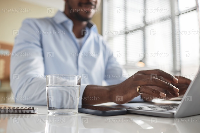 Близкий снимок чернокожего бизнесмена, печатающего на клавиатуре ноутбука