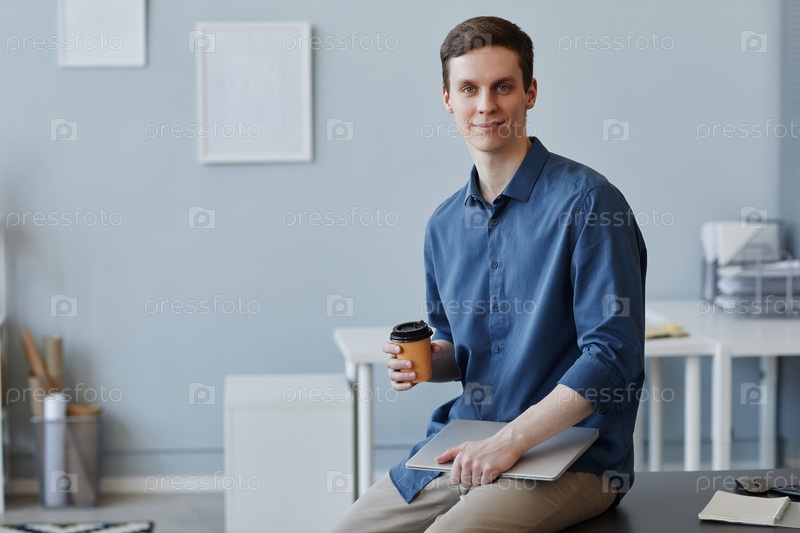 Бизнесмен смотрит на камеру, сидящий за столом в офисе