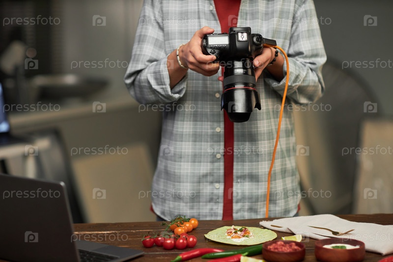 Фотограф делает фото еды на цифровом фотоаппарате