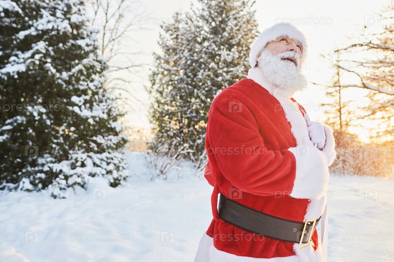 Санта-Клаус с сумкой в лесу