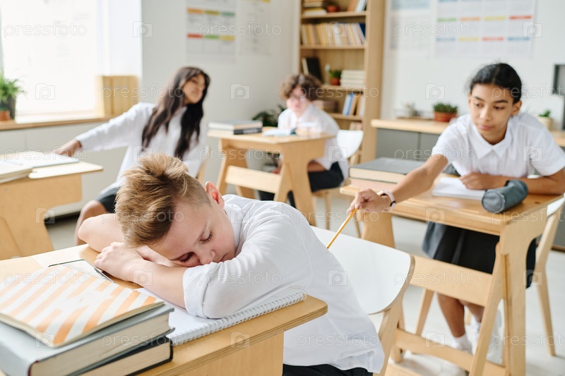 Школьник спит за столом на уроке