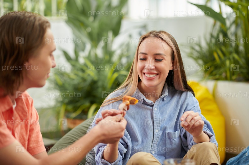 Мужчина делится закуской с девушкой