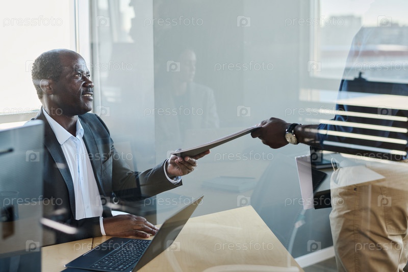 Старший мужской директор корпорации, получающий документ из рук подчиненного
