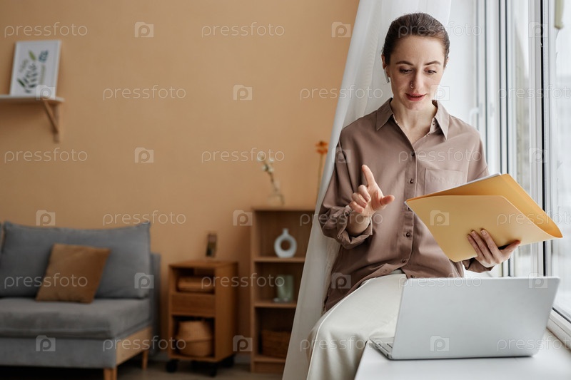 Молодая деловая женщина, работающая в домашнем интерьере у окна