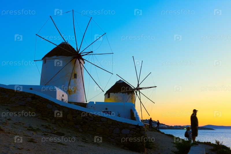 Ветряные мельницы на берегу моря в Миконосе на закате